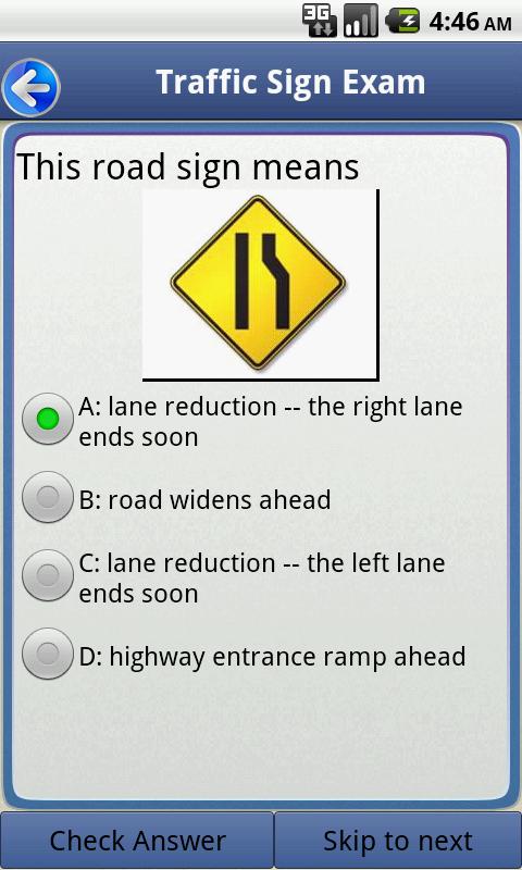 Questions are multiple choice and mostly cover road rules (approximately 45 of them) and road signs (about 5 of them.)
